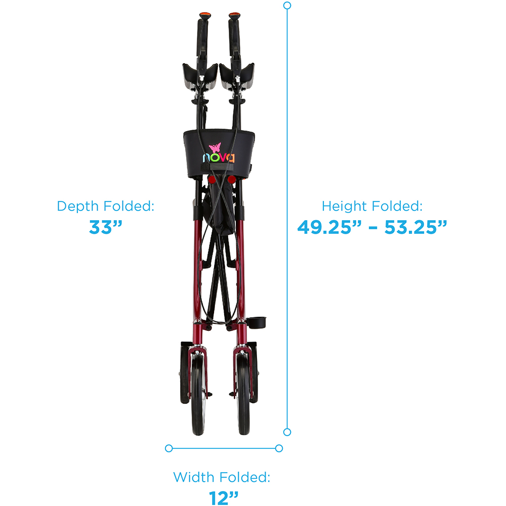 • CONTOURED & PADDED ADJUSTABLE FOREARM CUFFS keep forearms secure and comfortable. They are adjustable to give the perfect fit and feel – and also very durable and easy to clean. Comes with NOVA’s Easy to Use Locking Hand Bakes. The Extra-wide backrest with light padding makes sitting safe and comfortably. Seat handles provide support to sit and stand. Comes with both a front pouch with zipper closure and cane / umbrella holder.